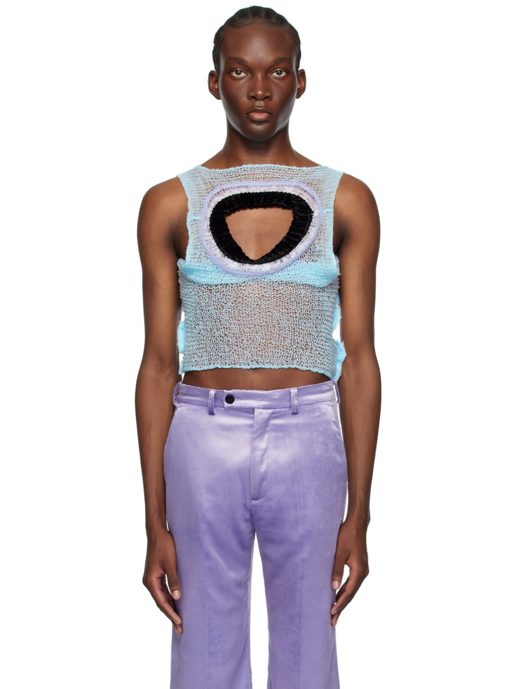 Semi-sheer open knit virgin wool- and cashmere-blend tank top. Viscose- and wool-blend chenille trim at rib knit crewneck. · Raw edge and pinched seam at side seams · Cutout at back Supplier color: Sky Body: 70% virgin wool, 30% cashmere. Trim: 80% viscose, 20% wool. Made in Italy 231379M214004