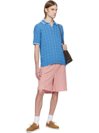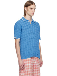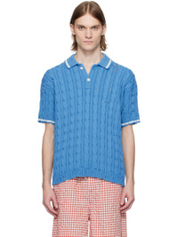Cable-knit cotton polo. Distressing throughout. · Rib-knit spread collar, hem, and cuffs · Stripe at collar and cuffs · Two-button placket · Hand-stitched logo at shoulder · Dropped shoulders Supplier color: Azure 100% cotton. Made in Italy 251379M212004