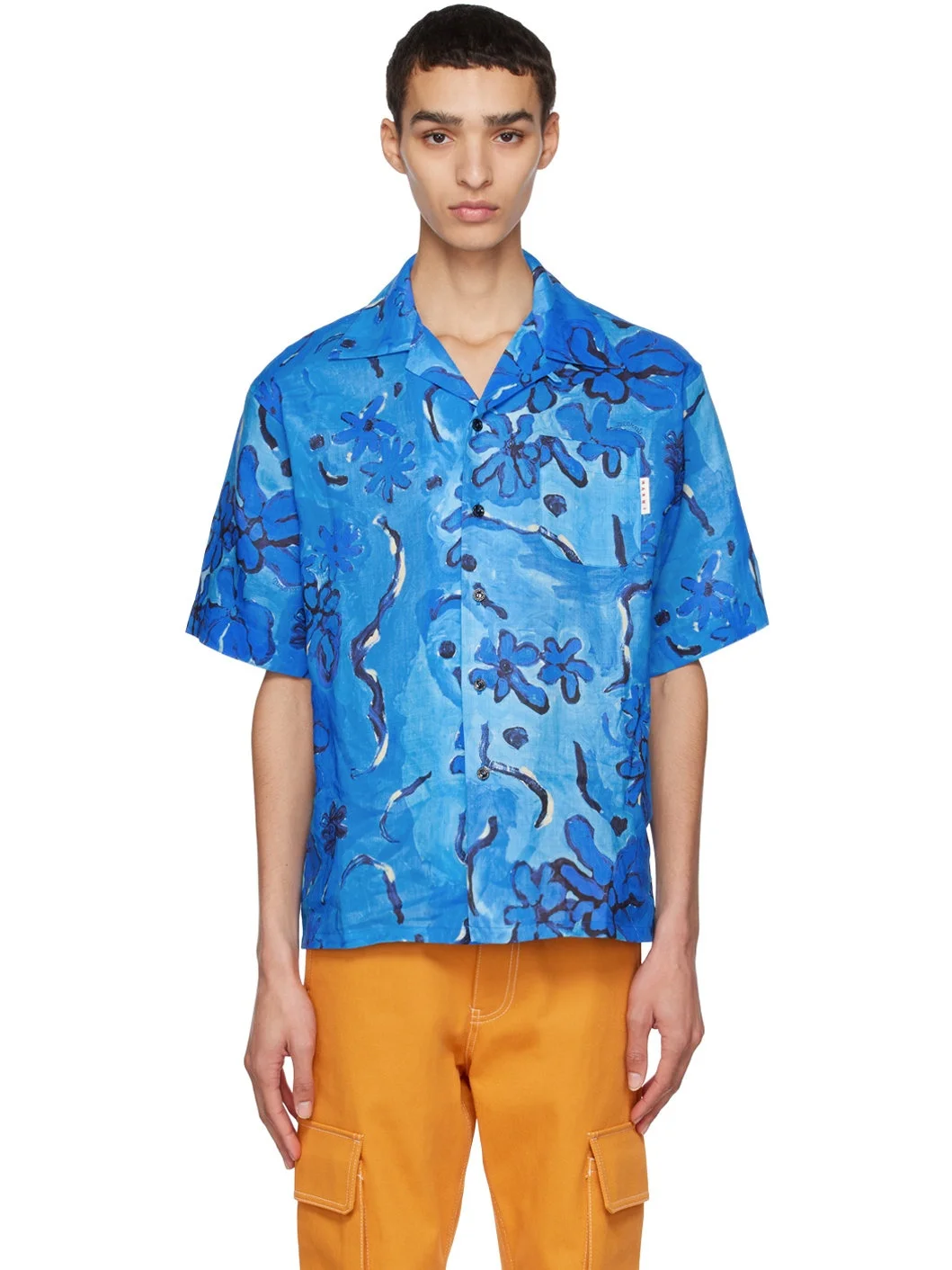Plain-woven ramie shirt. Graphic pattern printed throughout. · Open spread collar · Button closure · Textile logo flag at chest patch pocket Featuring artwork by Flaminia Veronesi. Supplier color: Azure