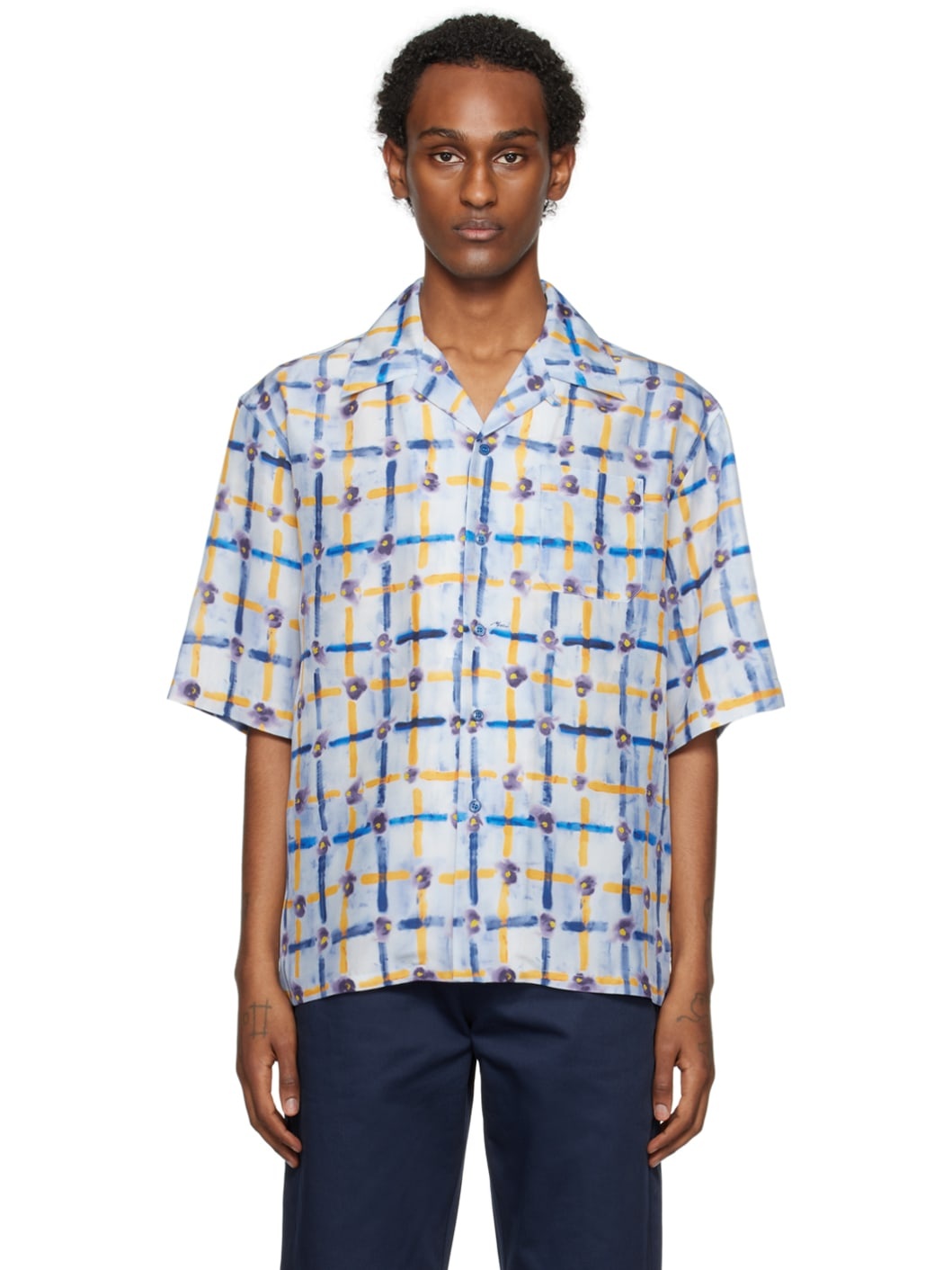 Silk habotai shirt. Graphic pattern printed throughout. · Open spread collar · Button closure · Patch pocket · Droptail hem Supplier color: Light blue 100% silk. Made in Romania 241379M192019