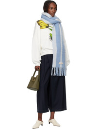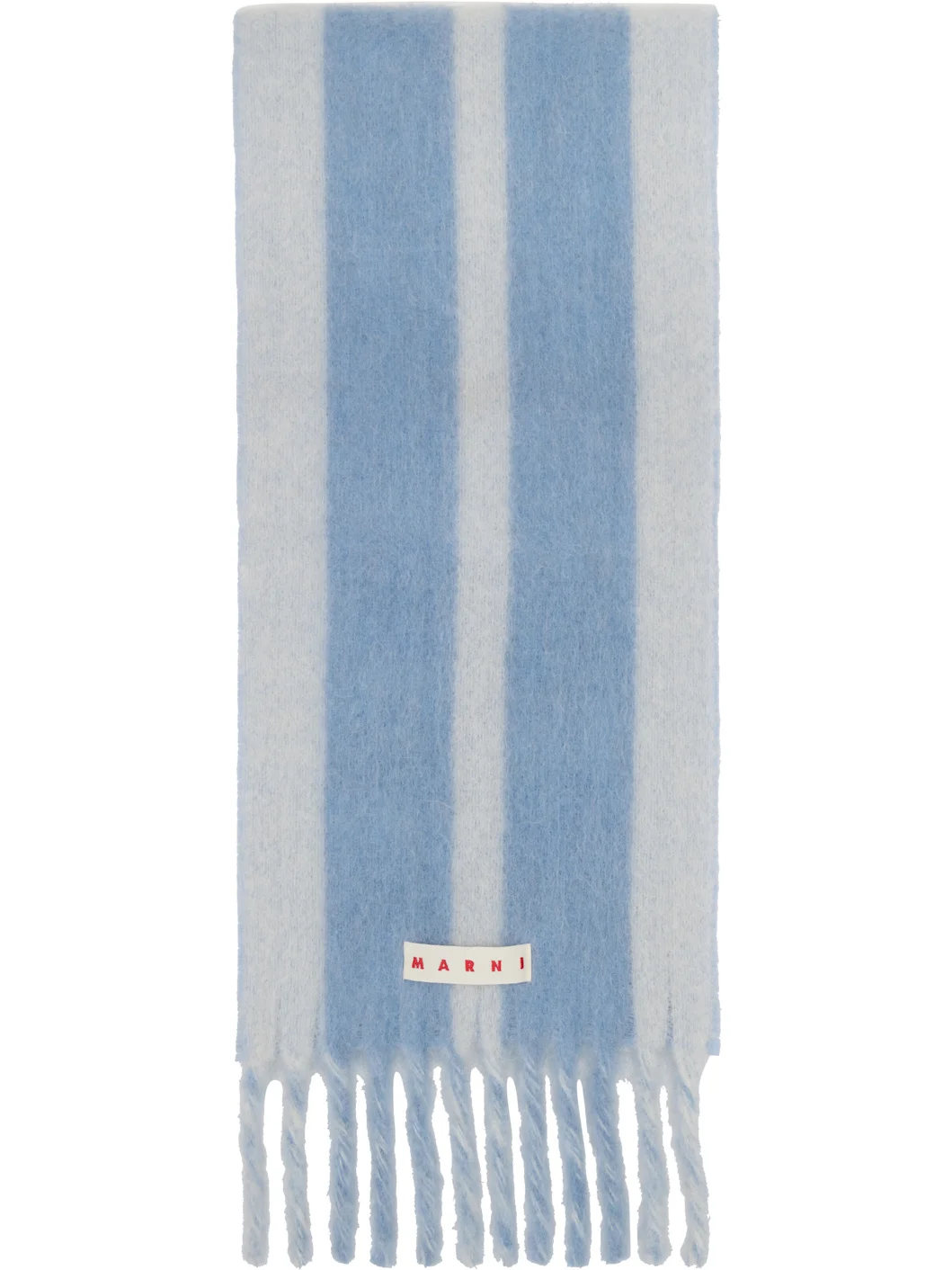 Rectangular brushed wool- and mohair-blend flannel scarf. · Stripes and embroidered logo patch at face · Jacquard logo at back face · Fringed detailing at ends · L90" x W11" Supplier color: Glass 50% wool, 20% polyamide, 15% mohair, 15% alpaca. Made in Italy 252379F028006