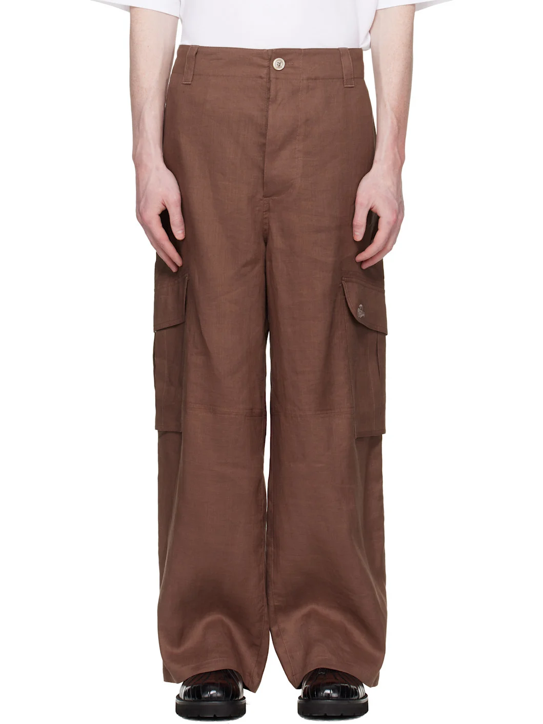 Lightweight ramie hopsack cargo pants. · Straight-leg · Belt loops · Four-pocket styling · Button fly · Adjustable button tab at cuffs · Cargo pocket at outseams · Logo embroidered at cargo pocket Supplier color: Tobacco 100% ramie. Made in Italy 261379M188001