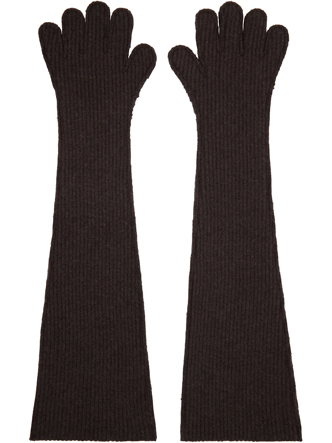 Rib-knit virgin wool gloves in brown. Pinched seams throughout. Supplier color: Chestnut