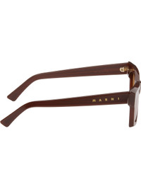 Handcrafted rectangular semi-transparent acetate-frame sunglasses in brown. · Brown lenses · Integrated nose pads · Logo stamp at temples · Exposed core wires · Includes pouch · Size: 55.21 145 Part of the Marni x RETROSUPERFUTURE collaboration. Supplier color: Kobicha Acetate. Made in Italy 252379M134033