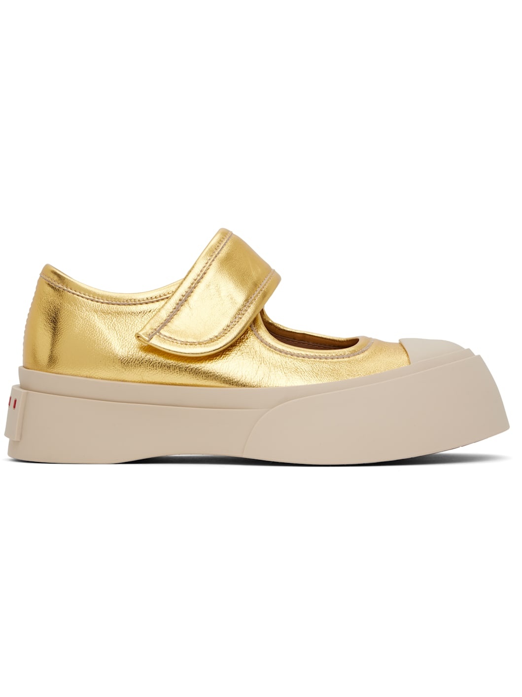 Grained leather Mary Jane-style ballerina flats in gold tone. · Rubber cap toe · Velcro strap at vamp · Metal eyelets at inner side · Buffed calfskin lining · Logo embossed at heel · Treaded rubber platform sole · Platform: H1.75" Supplier color: Gold Upper: leather. Sole: rubber. Made in Italy 251379F118014