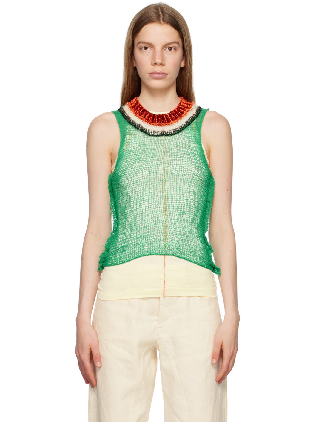 Semi-sheer open knit virgin wool- and cashmere-blend tank top. Viscose- and wool-blend chenille trim at rib knit crewneck. · Raw edge and pinched seam at side seams · Cutout at back Supplier color: Kiwi Body: 70% wool, 30% cashmere. Trim: 80% viscose, 20% wool. Made in Italy 231379F111007