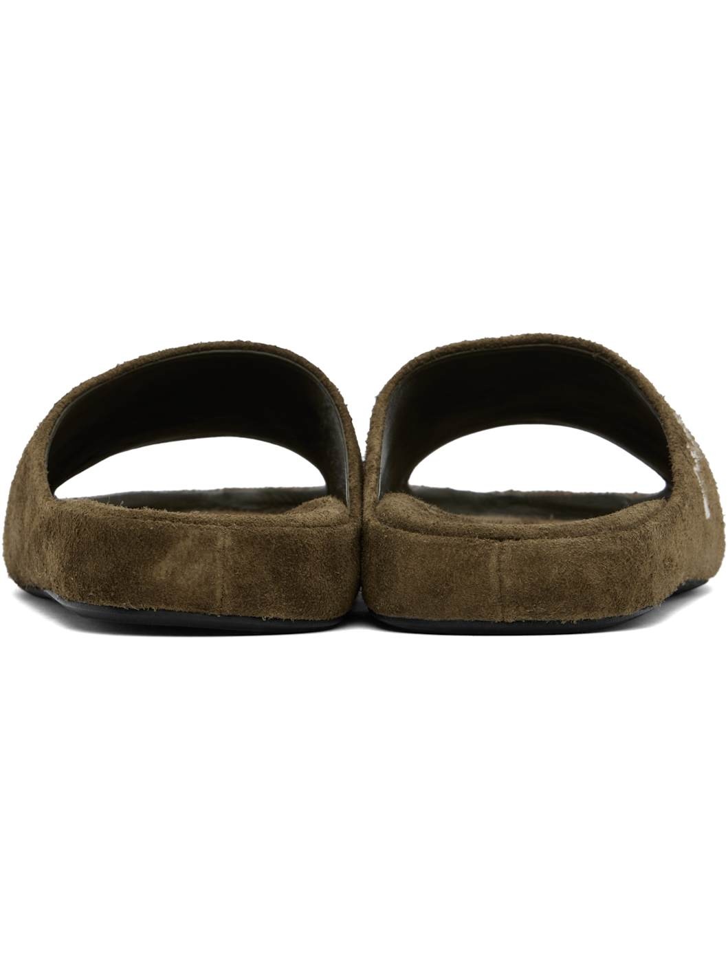 Calfskin suede slip-on sandals in khaki. · Open toe · Hand-stitched logo at vamp · Logo embossed at suede footbed · Treaded rubber sole Supplier color: Olive