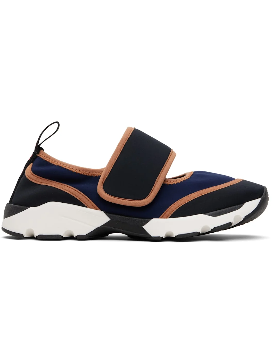 Low-top bonded jersey Mary Jane-style sneakers. · Velcro strap at vamp · Logo-printed pull-loop at hell collar · Foam rubber midsole · Treaded rubber sole Supplier color: Dark blue/Black Upper: textile. Sole: rubber. Made in Italy 261379F128001