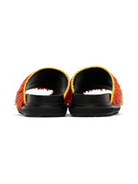 Crocheted raffia slip-on sandals in orange and yellow. Fringed detailing throughout. · Open round toe · Logo embossed at molded footbed · Treaded rubber sole Supplier color: Carrot/Yellow Upper: textile, goatskin. Sole: rubber. Made in Italy 231379F124035