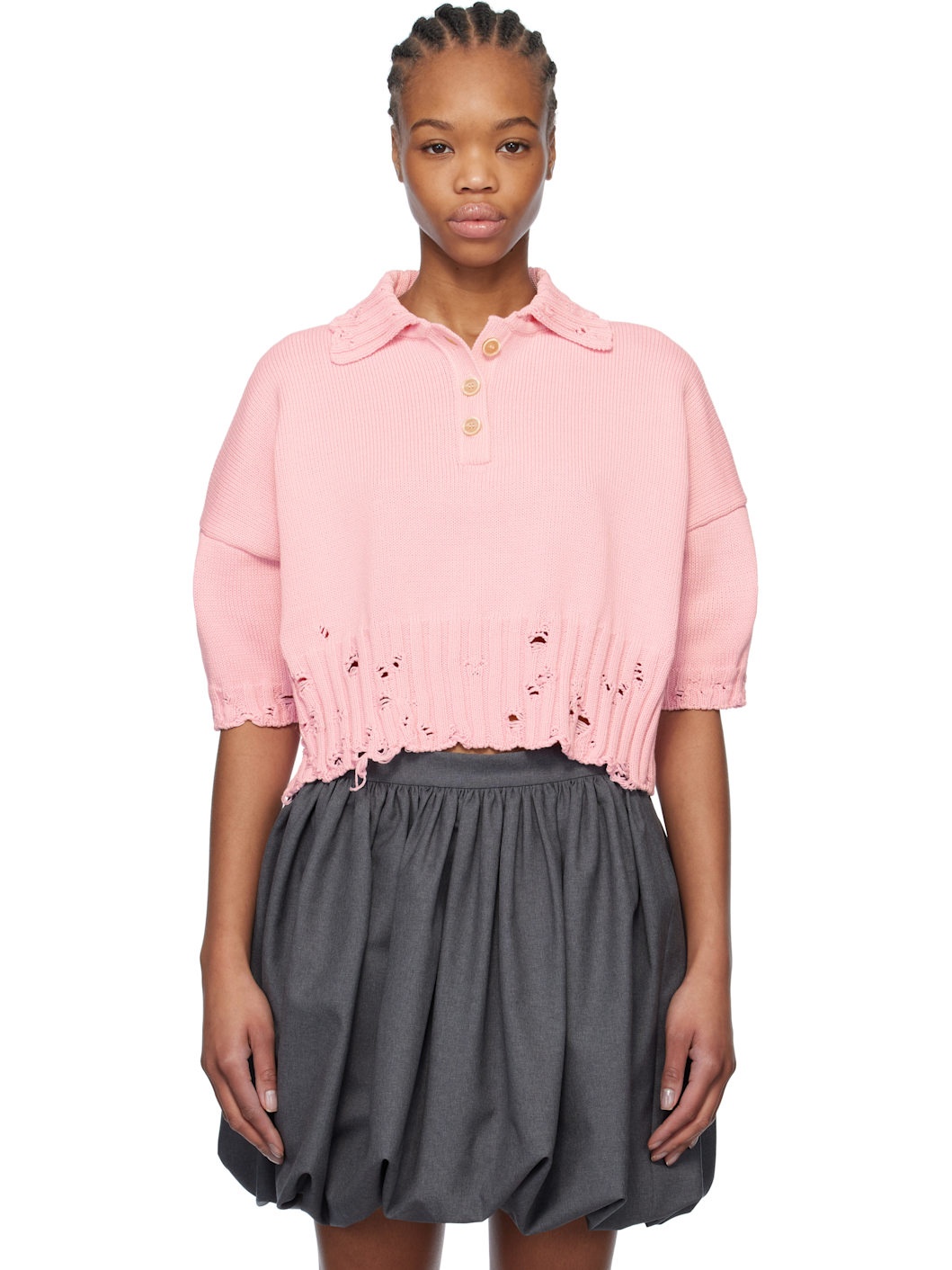 Knit cotton polo. Distressing throughout. · Rib-knit spread collar, cropped hem, and cuffs · Three-button placket · Hand-embroidered logo at back collar Supplier color: Pink gummy 100% cotton. Made in Italy 251379F108000