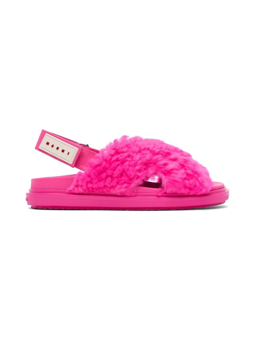Buffed calfskin and shearling sandals in pink. · Open square toe · Criss-crossing straps at vamp · Logo patch at velcro ankle strap · Logo embossed at heel · Logo embossed at molded leather footbed · Buffed calfskin lining · Treaded rubber sole Supplier color: Starlight pink Upper: lambskin, calfskin. Sole: rubber. Made in Italy 232379F124006