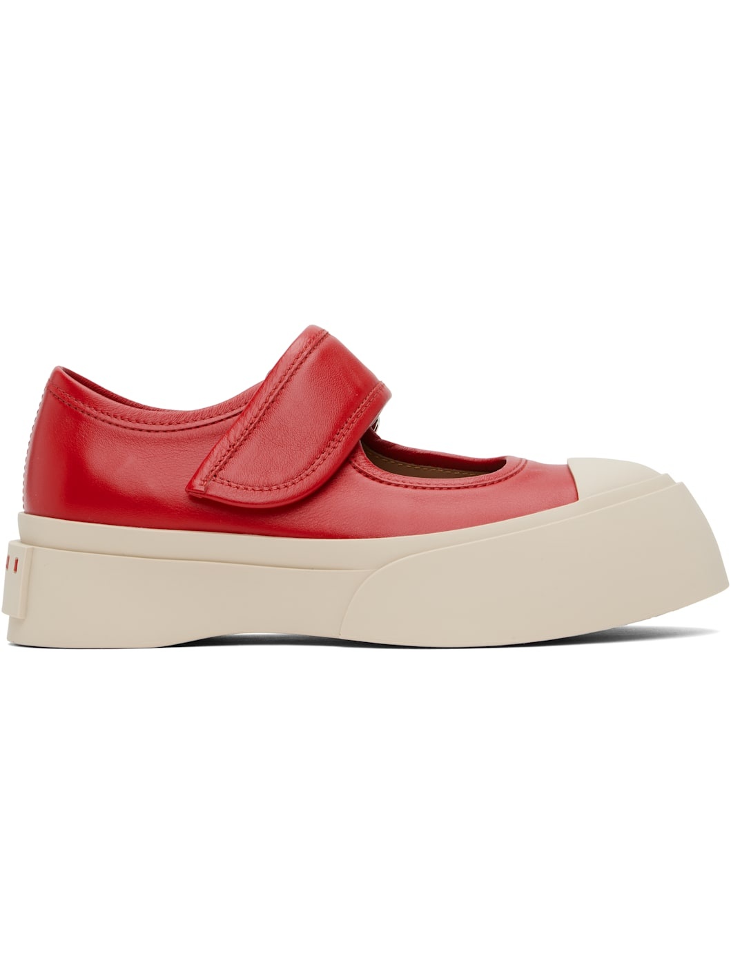 Low-top buffed nappa calfskin Mary Jane-style sneakers in red. · Rubber cap toe · Velcro strap at vamp · Metal eyelets at inner side · Buffed sheepskin lining · Logo embossed at heel · Treaded rubber platform sole · Platform: H1.75" Supplier color: Crimson Upper: calfskin. Sole: rubber. Made in Italy 251379F118002