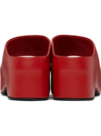 Buffed leather heeled sandals in red. · Open toe · Logo embossed at collar and molded footbed · Covered platform midsole · Treaded rubber sole · Platform: H2" · Heel: H2.75" Supplier color: Tulip Upper: leather. Sole: rubber. Made in Italy 251379F125002