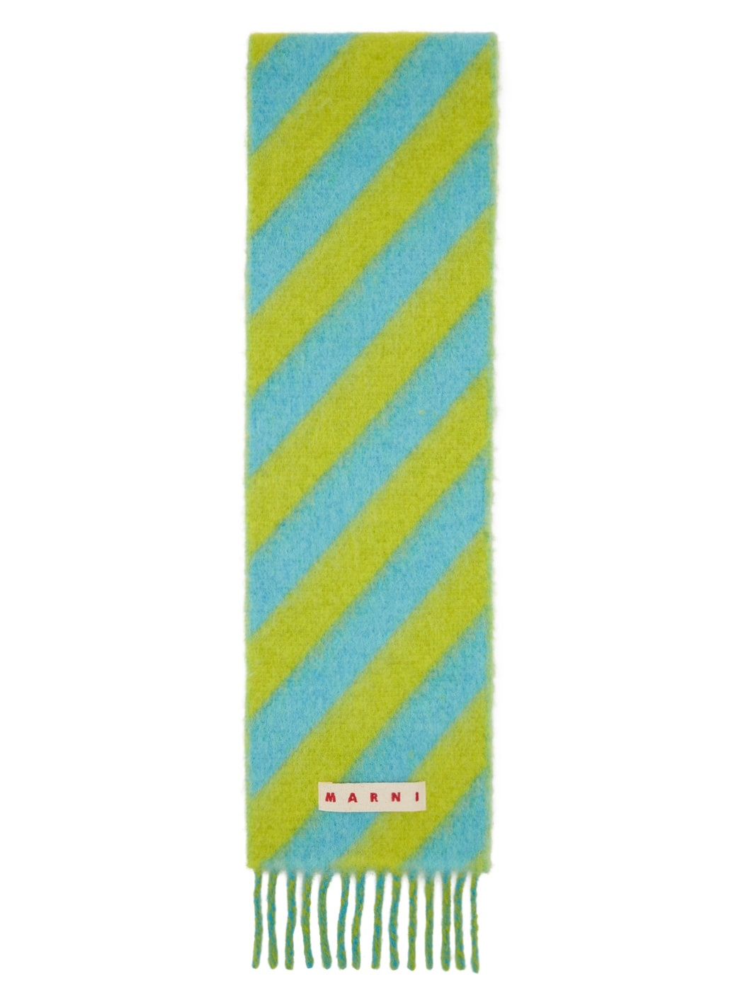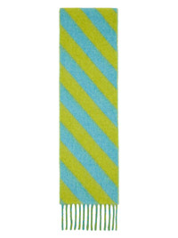 Rectangular brushed knit wool- and alpaca-blend scarf in green and blue. · Jacquard stripes throughout · Fringed detailing at ends · Logo patch at end · L98" x W7" Available exclusively at SSENSE. Supplier color: Acid 50% wool, 30% alpaca, 20% polyamide. Made in Italy 241379F028000