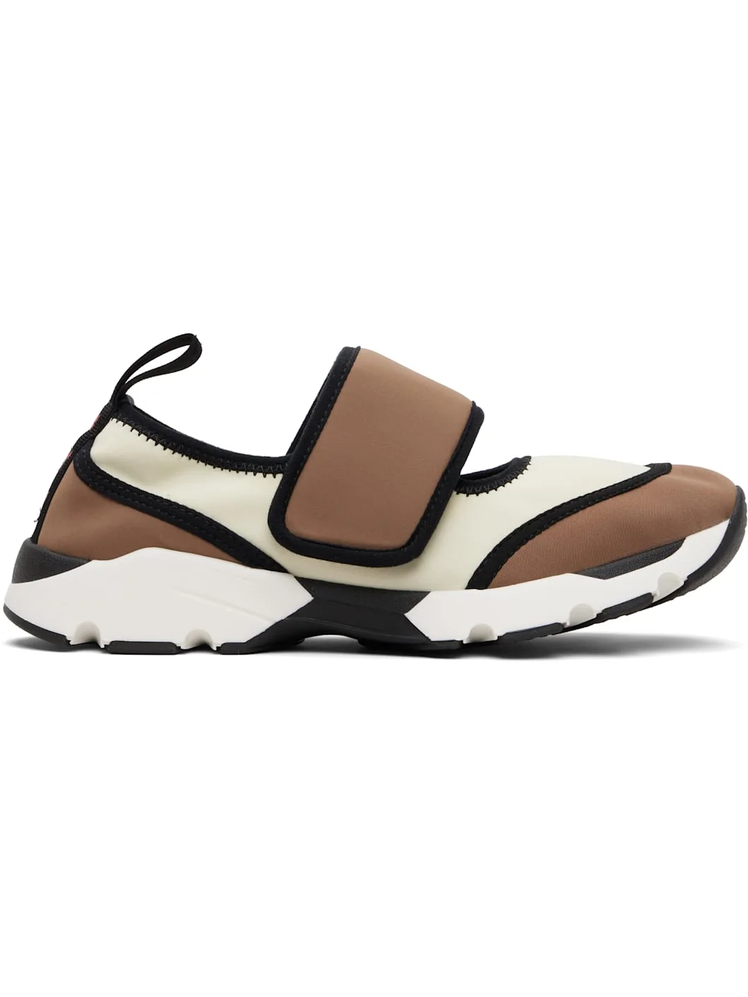 Low-top paneled stretch jersey Mary Jane-style sneakers. · Velcro strap at vamp · Logo-printed pull-loop at heel collar · Jersey lining · Treaded rubber sole Supplier color: White/Light brown Upper: textile. Sole: rubber. Made in Italy 261379F128000