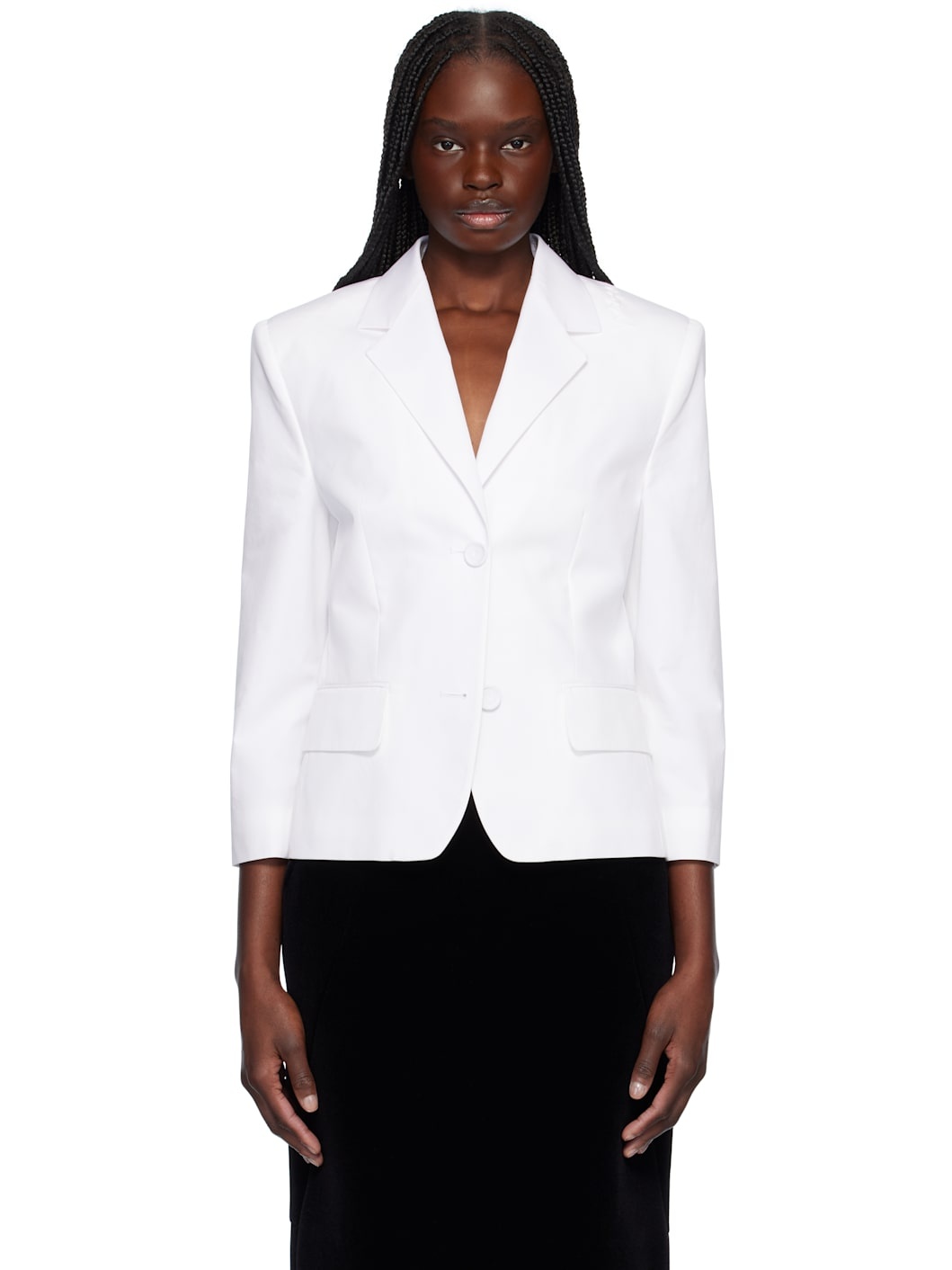 Organic cotton poplin blazer. · Notched lapel · Button closure · Darts at chest · Flap pockets · Logo embroidered at shoulder · Buttoned surgeon's cuffs · Welt pocket at interior · Satin-lined sleeves · Cotton-blend twill lining Supplier color: Lily white Body: 100% cotton. Lining 1: 69% cotton, 31% polyamide. Lining 2: 58% acetate, 42% cupro. Made in Italy 251379F057001