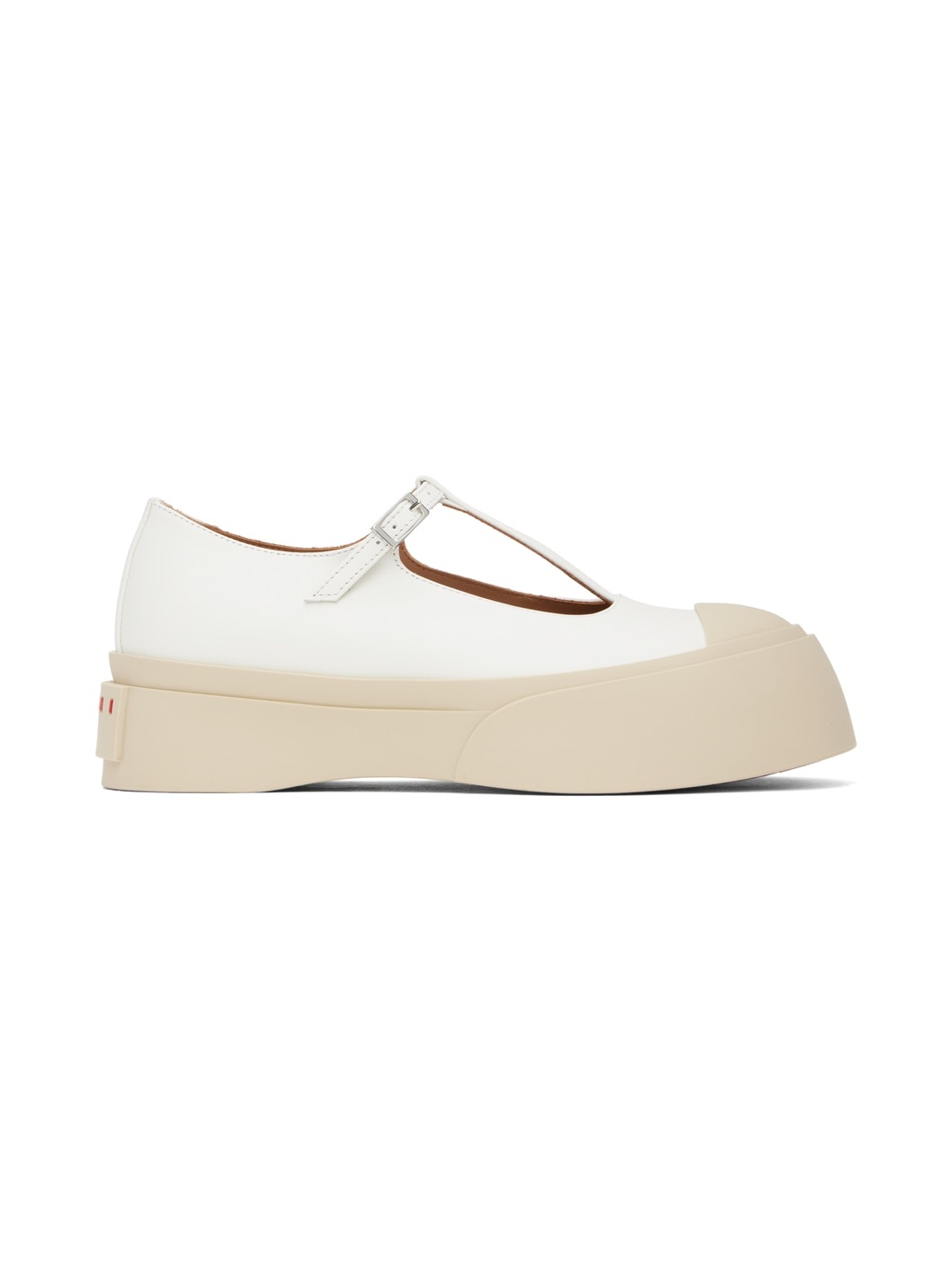 Buffed leather Mary Jane-style ballerina flats in white. · Rubber cap toe · Pin-buckle strap at vamp · Logo embossed at padded leather footbed · Buffed leather and nubuck lining · Rubberized logo patch at heel · Treaded rubber sole Supplier color: Lily white Upper: leather. Sole: rubber. Made in Italy 242379F118000
