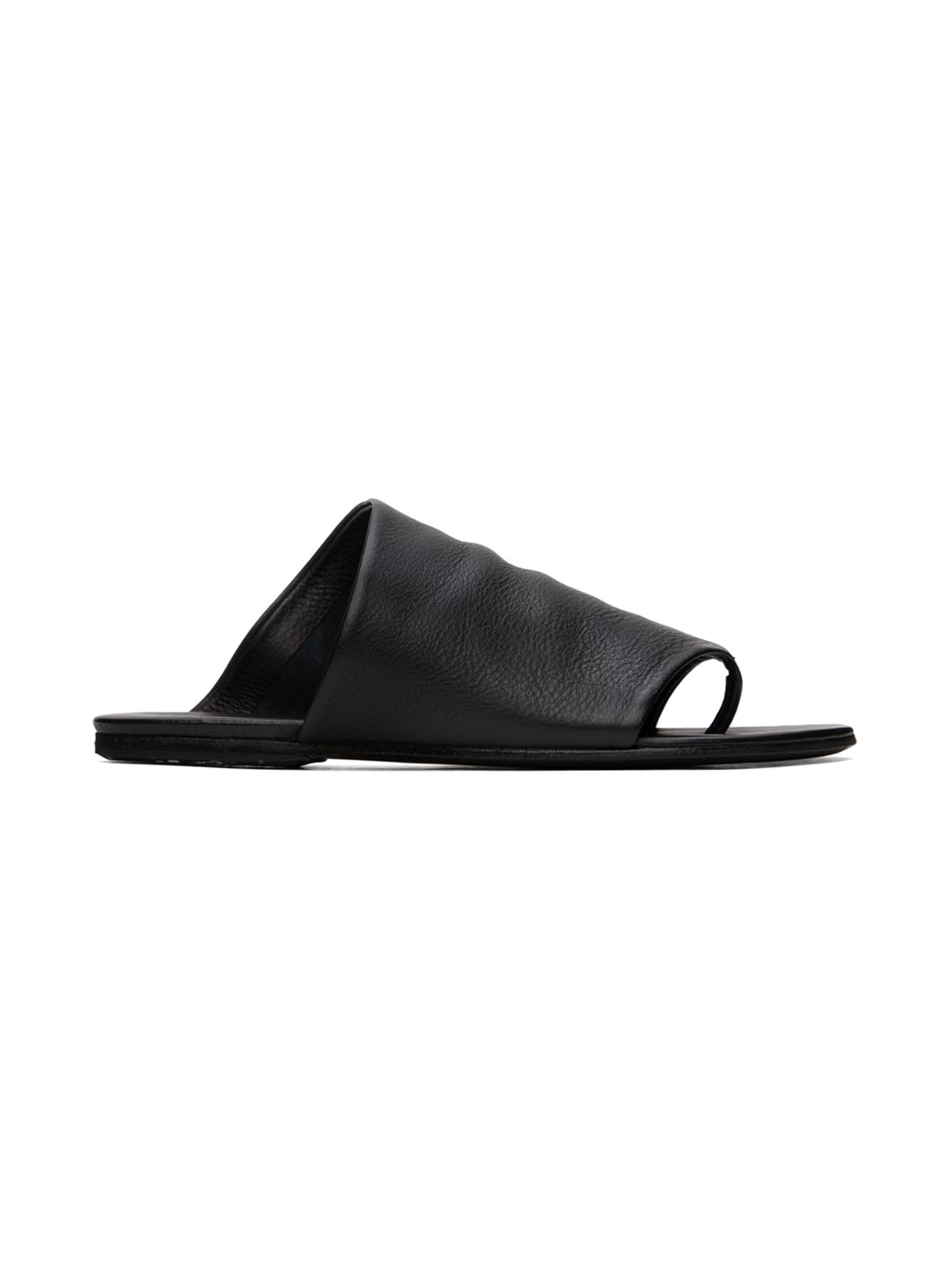 Handcrafted grained leather slip-on sandals in black. · Asymmetrical construction · Open toe · Thong-style strap at vamp · Logo embossed at footbed · Suede lining · Leather sole with rubber injection Supplier color: Black Upper: leather. Sole: leather, rubber. Made in Italy 241349F124011