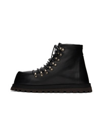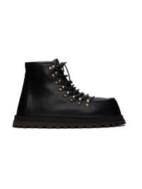 Ankle-high buffed leather boots in black. · Moc toe · Lace-up closure · Padded tongue and collar · Grained leather lining · Logo-printed padded hand-wrapped leather insole · Stacked foam rubber midsole · Treaded rubber sole Supplier color: Black/Dark brown Upper: leather. Sole: rubber. Made in Italy 242349F113001