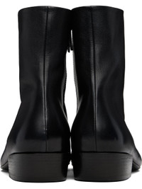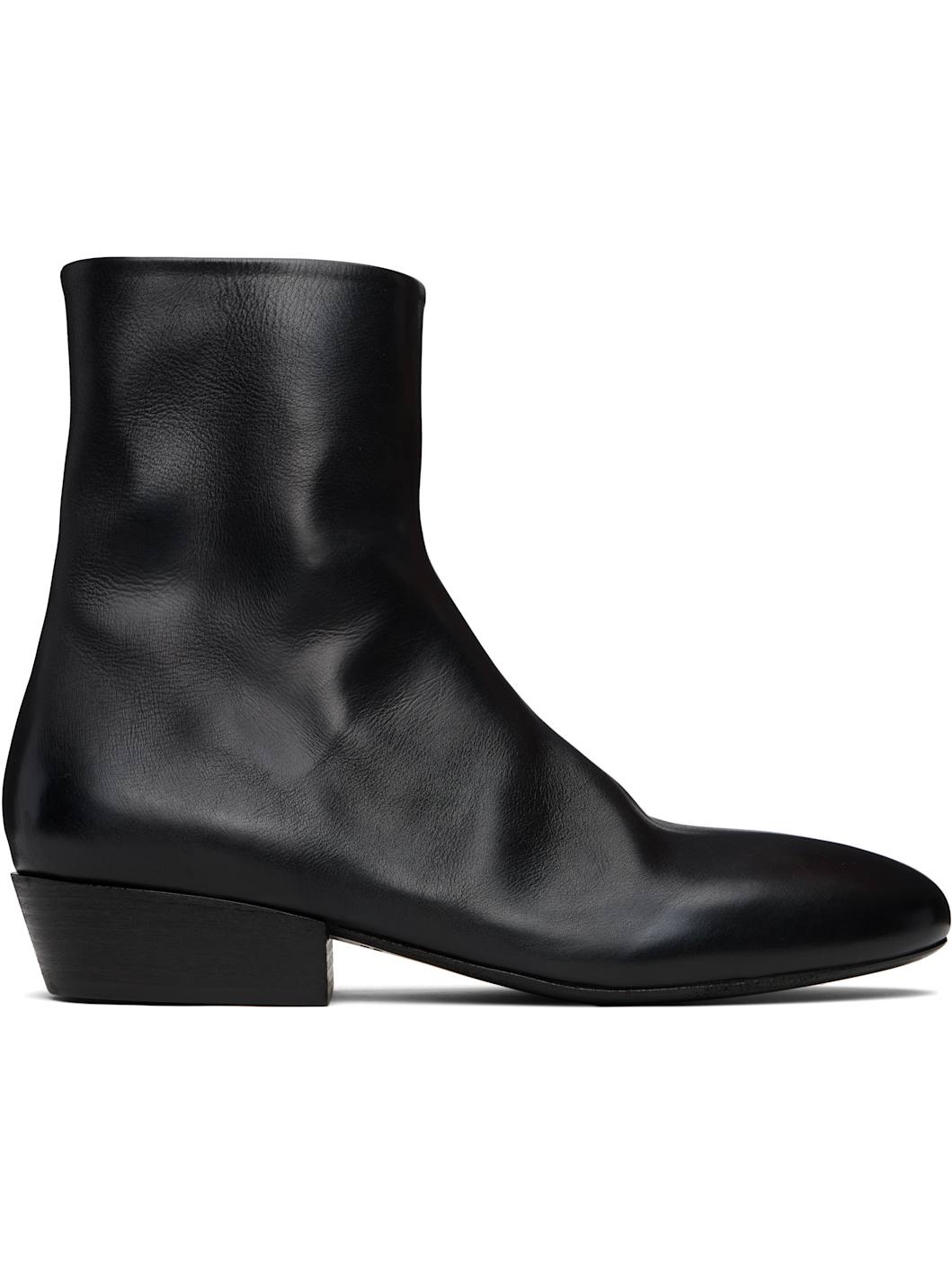 Ankle-high buffed leather boots. · Zip closure at inner side · Stacked leather heel with rubber injection · Leather sole · Heel: H1.25" Supplier color: Black Upper: leather. Sole: leather, rubber. Made in Italy 252349M223018