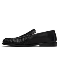Buffed leather loafers. · Gathering at moc toe · Stacked leather heel with rubber injection · Leather sole Supplier color: Black Upper: leather. Sole: leather, rubber. Made in Italy 252349F121003