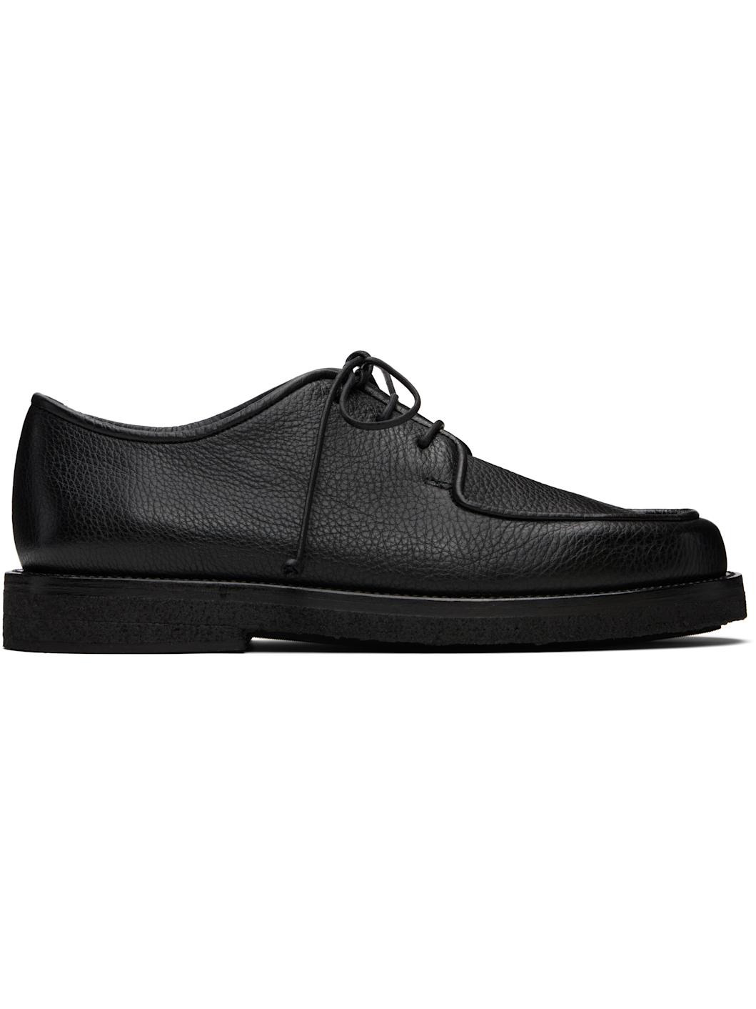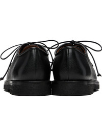 Grained leather derbys. · Moc toe · Lace-up closure · Buffed leather lining · Topstitching at welt · Stacked foam rubber heel and midsole · Treaded rubber sole Supplier color: Black Upper: leather. Sole: rubber. Made in Italy 252349M225014