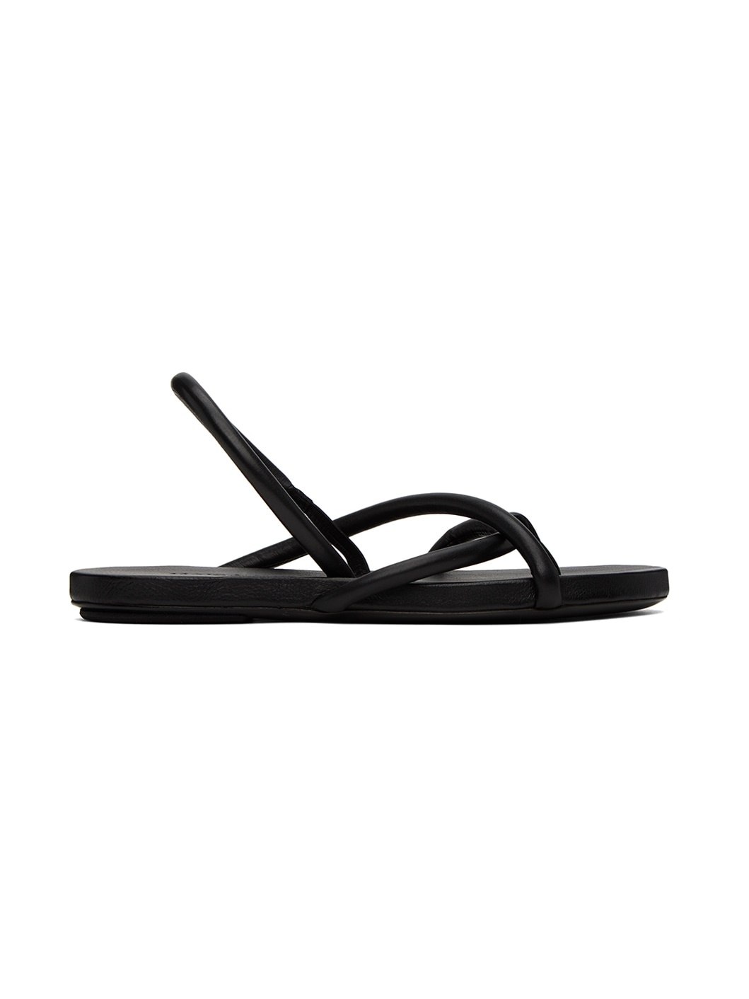 Hand-dyed padded buffed leather flat sandals in black. · Criss-crossing thong-style straps at vamp · Partially-elasticized slingback strap · Logo embossed at grained leather footbed · Leather outsole with rubber injection Supplier color: Black Upper: leather. Sole: rubber, leather. Made in Italy 231349F124037