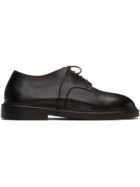 Buffed leather derbys. · Lace-up closure · Topstitching at welt · Stacked leather heel with rubber injection · Leather sole Supplier color: Dark brown Upper: leather. Sole: leather, rubber. Made in Italy 252349M225026