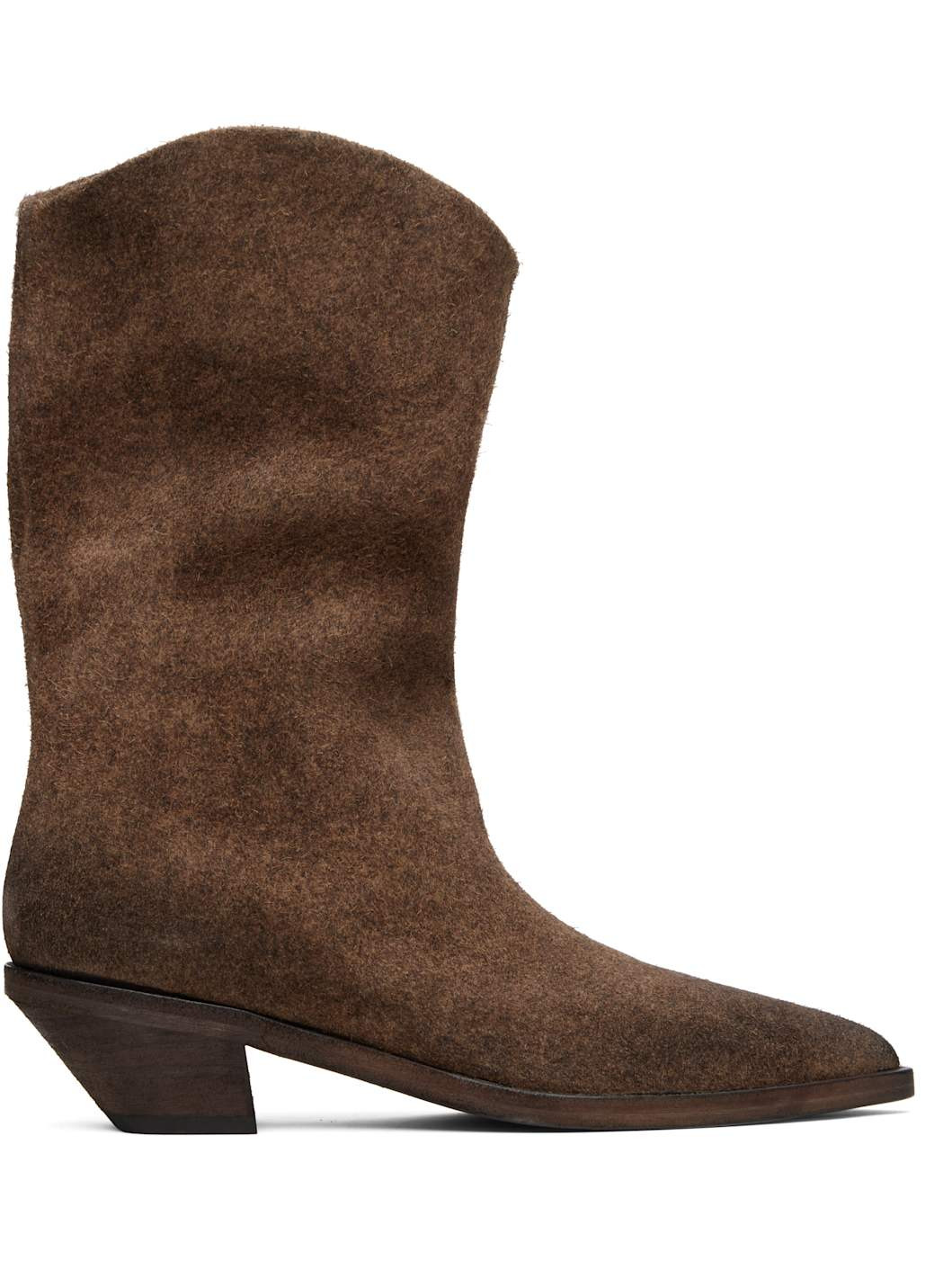 Mid-calf suede boots. · Pointed toe · Buffed leather lining · Stacked leather heel with rubber injection · Leather sole with rubber injection · Heel: H2" Supplier color: Dark brown Upper: leather. Sole: leather, rubber. Made in Italy 252349F113011
