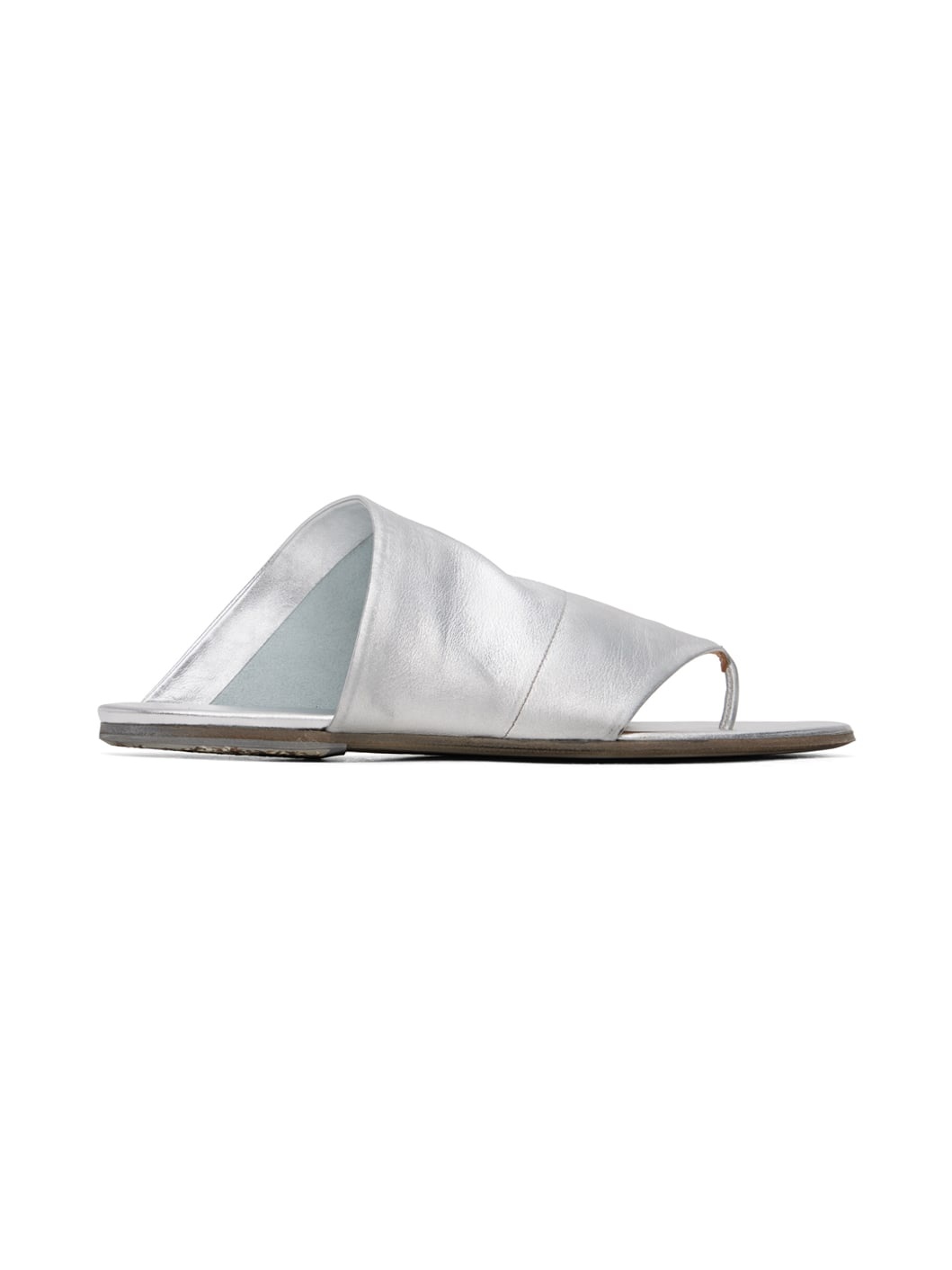 Handcrafted grained leather slip-on sandals in silver-tone. · Asymmetric construction · Open toe · Thong-style strap at vamp · Logo embossed at footbed · Suede lining · Leather sole with rubber injection Supplier color: Argento Upper: leather. Sole: leather, rubber. Made in Italy 241349M231005