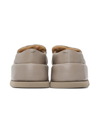 Handcrafted padded buffed calfskin loafers in taupe. · Moc toe · Strap at vamp · Logo embossed at leather footbed · Buffed leather and suede lining · Covered platform midsole · Treaded foam rubber sole · Platform: H2.5" Supplier color: Clay Upper: calfskin. Sole: rubber. Made in Italy 242349F121006