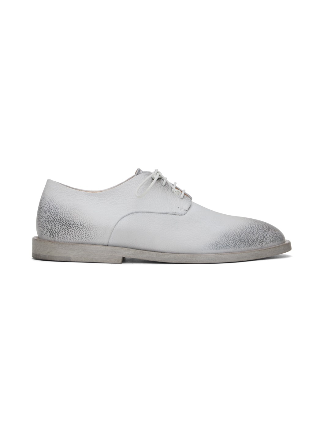 Pebble-grained leather derbys in white. · Smudging throughout · Lace-up closure · Suede and grained leather lining · Stacked leather heel with rubber injection · Leather sole · Heel: H1" Supplier color: White Upper: leather. Sole: rubber. Made in Italy 241349M225037