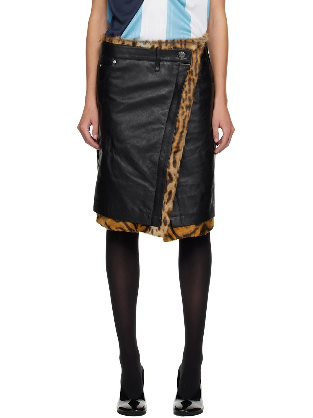 Grained calfskin midi skirt. · Wrap construction · Leopard-printed faux-fur trim throughout · Belt loops · Three-pocket styling · Vent at front hem · Full quilted satin lining · Logo-engraved silver-tone hardware Supplier color: Black Body: 100% calfskin. Trim: 67% cotton, 33% viscose. Lining: 100% polyester. Made in Italy 252892F092000