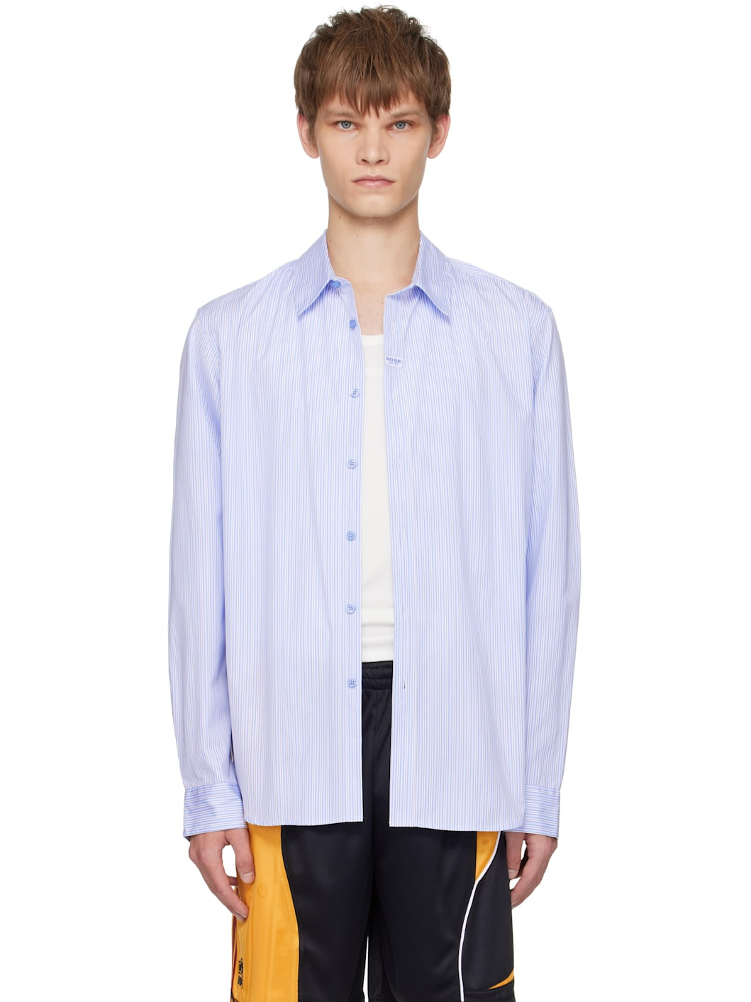Cotton poplin shirt. · Stripes throughout · Spread collar · Button closure · Logo patch at front · Shirttail hem · Buttoned barrel cuffs · Box pleat at back yoke Supplier color: Blue stripe 100% cotton. Made in Portugal 252892M192017