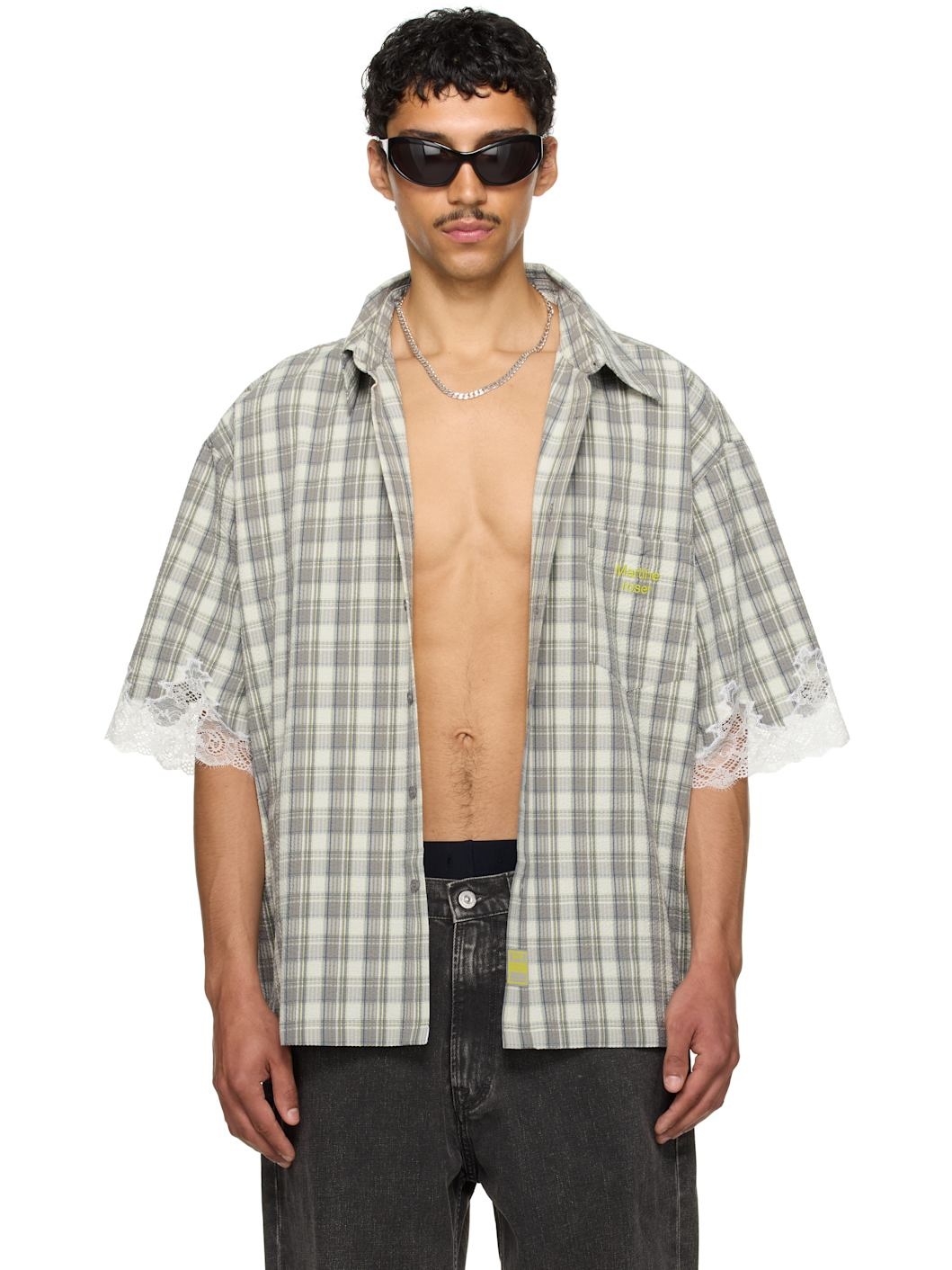 Cotton seersucker overshirt. Check pattern throughout. · Spread collar · Button closure · Logo-embroidered patch pocket · Reflective logo patch at front · Dropped shoulders · Scalloped lace trim at cuffs · Box pleat at back yoke Part of the exclusive SSENSE HEAT capsule. Supplier color: Grey lime check Body: 100% cotton. Trim: 100% polyester. Made in Bulgaria 252892M192001