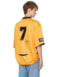 Jersey T-shirt. · Jacquard graphic pattern throughout · Rib-knit V-neck · Logo printed at chest and back · Piping at hem and cuffs · Logo patch at cuff · Text flocked at back Supplier color: Yellow gold 100% polyester. Made in Portugal 252892M213004