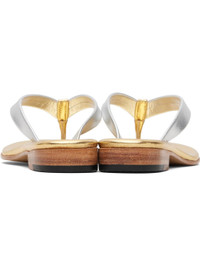 Buffed kidskin flip-flops. · Open toe · Thong-style strap · Logo embossed at footbed · Stacked leather heel with textured rubber injection · Smooth leather sole Supplier color: Silver/Gold Upper: kidskin. Sole: leather, rubber. Made in Argentina 251778F124000