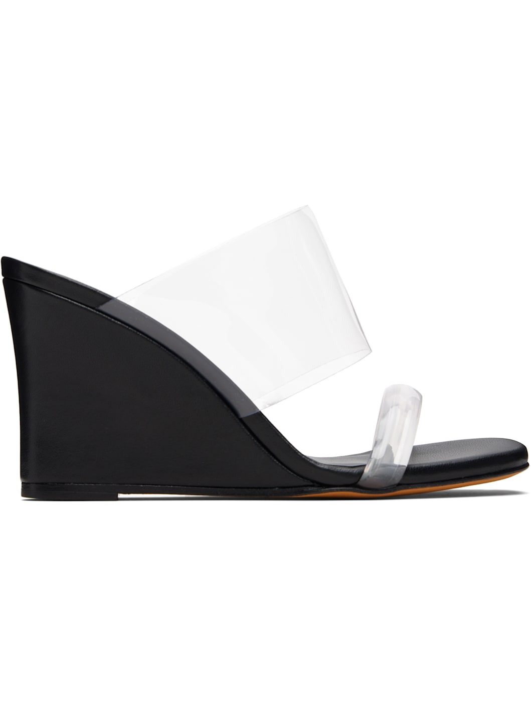 Transparent Perspex® heeled sandals. · Open square toe · Straps at vamp · Logo embossed at padded buffed leather footbed · Leather-covered wedge heel with rubber injection · Nubuck sole · Heel: H3.25" Part of the exclusive SSENSE HEAT capsule. Supplier color: Black Upper: rubber. Sole: leather, rubber. Made in Italy 252779F125002