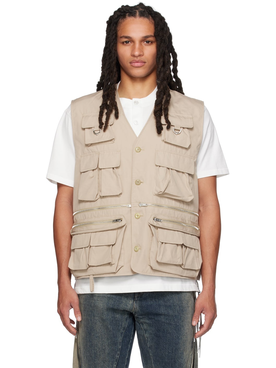 Cotton-blend canvas vest. · Y-neck · Button closure · Zip and bellows pockets · D-ring hardware at chest and back collar · Logo graphic embroidered at back collar · Zip pocket and logo embroidered at back hem · Integrated logo strap at interior · Full mesh lining · Logo-engraved silver-tone hardware Supplier color: Sand