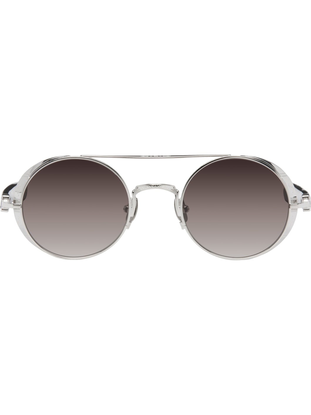 Handcrafted round titanium- and acetate-frame sunglasses in silver tone. · Filigree detailing and logo pattern throughout · Top bar · Gradient black lenses · Adjustable titanium nose pads · Logo hardware at temple tips · Includes case · Size: 48.22 135 Supplier color: Palladium white Titanium, acetate. Made in Japan 252167M134022