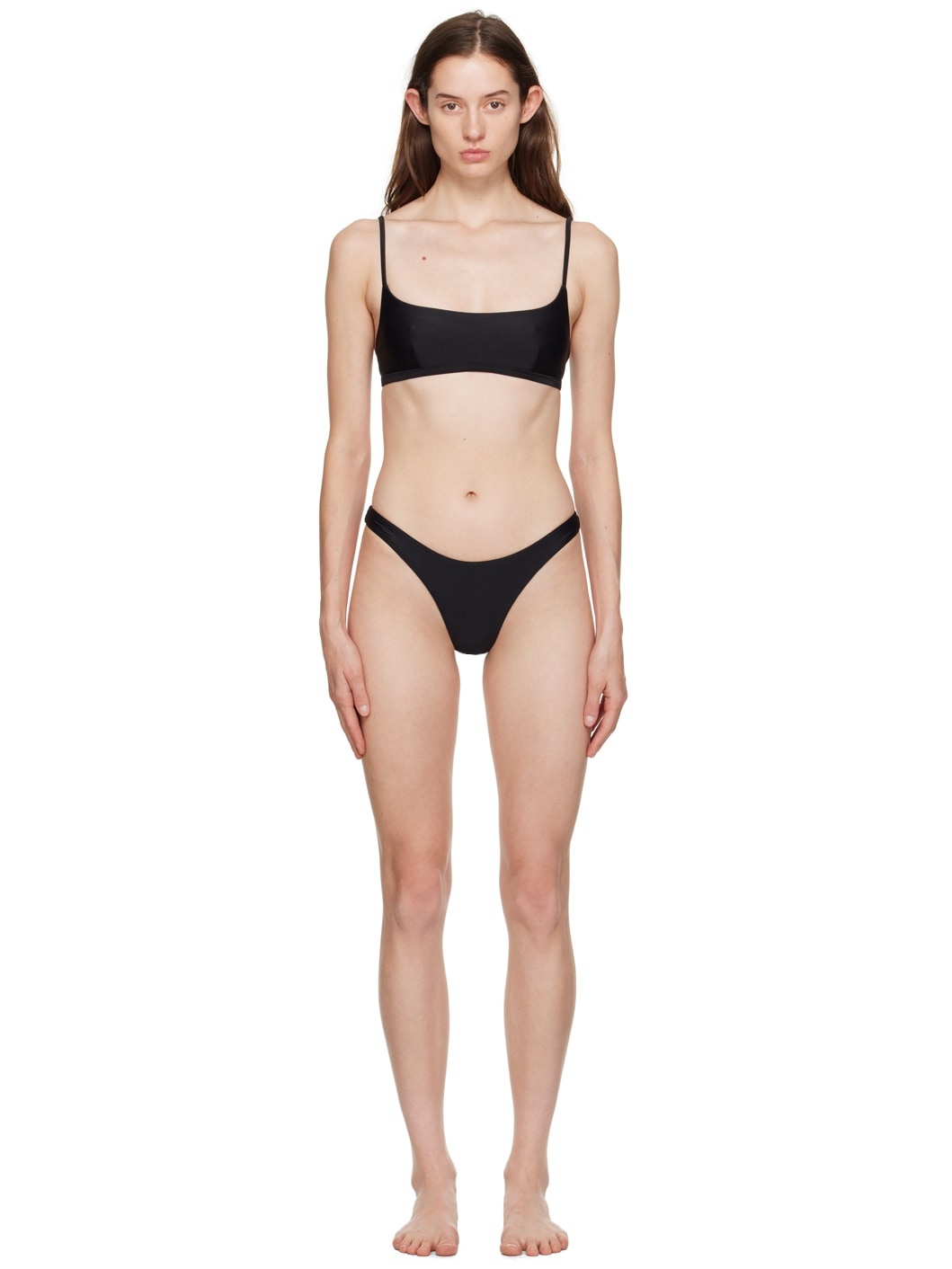 Stretch nylon jersey bikini top. · Scoop neck · Adjustable spaghetti straps · Hook-eye fastening at back · Full stretch jersey lining Stretch nylon jersey bikini bottom. · High-rise · Full stretch jersey lining Supplier color: Black 80% nylon, 20% elastane. Made in Australia 241946F105009