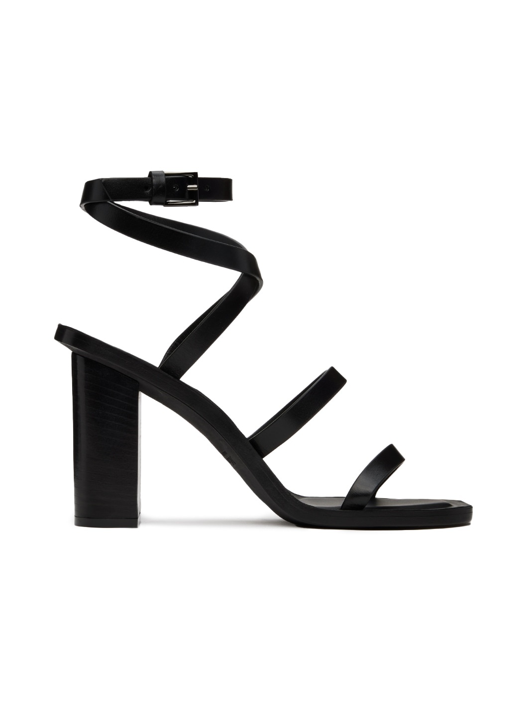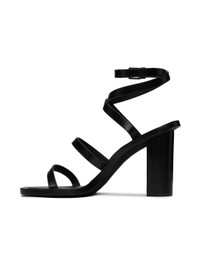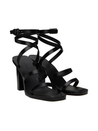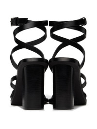 Grained leather heeled sandals in black. · Open toe · Straps at vamp · Wraparound pin-buckle ankle strap · Logo-embossed padded leather footbed · Stacked leather block heel · Leather sole with rubber injection · Heel: H4" Supplier color: Black Upper: leather. Sole: leather, rubber. Made in Italy 241118F125000