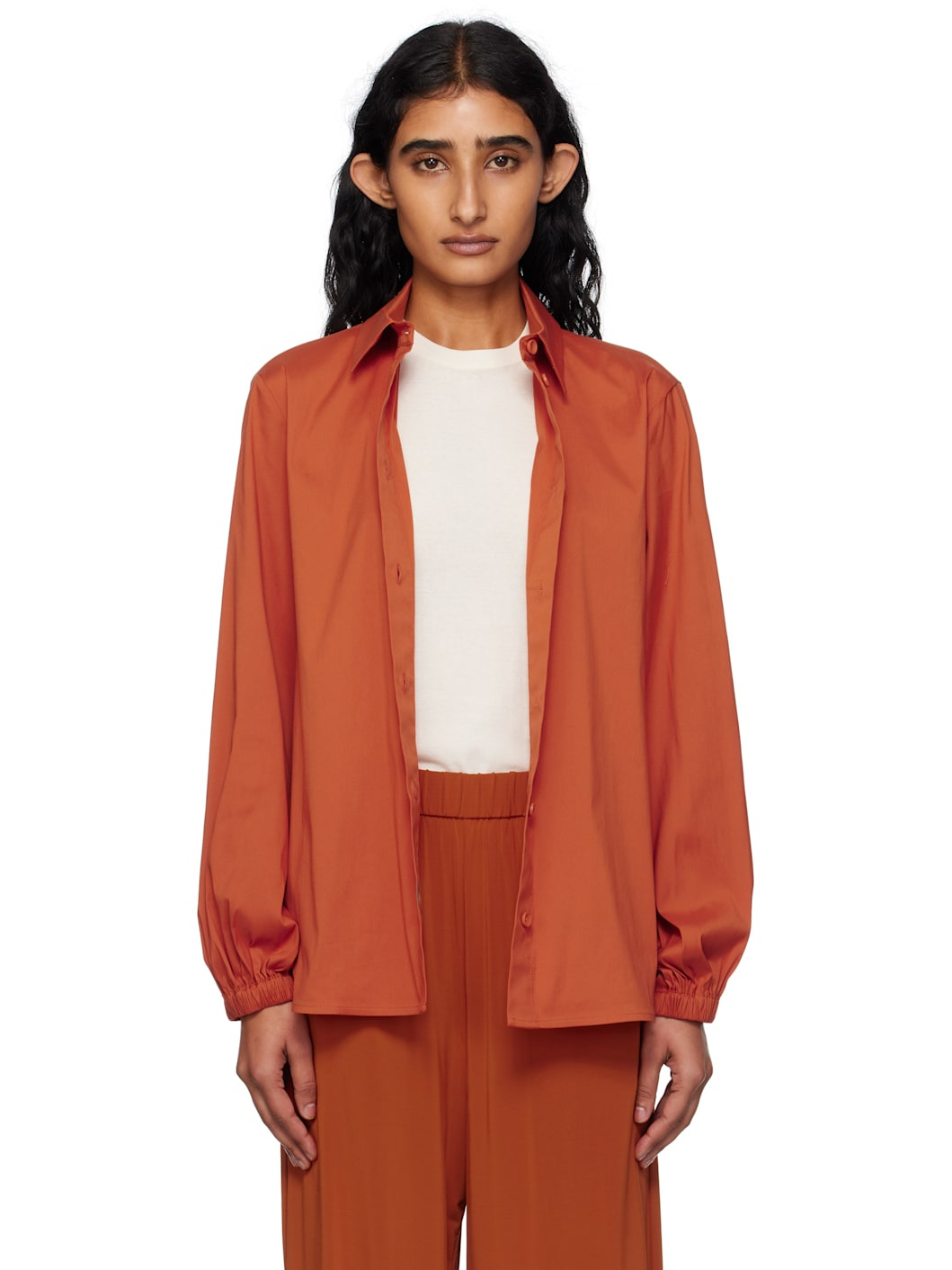 Stretch cotton-blend poplin shirt. · Spread collar · Button closure · Shirttail hem · Elasticized cuffs · Gathering at back yoke Part of the Max Mara Beachwear collection. Supplier color: Orange 78% cotton, 20% nylon, 2% elastane. Made in Turkey 251118F109019