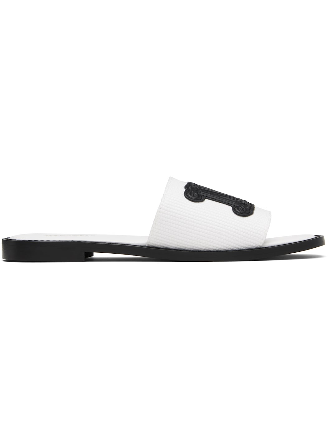 Cotton canvas slip-on sandals. · Open square toe · Leather logo applique at vamp · Logo stamp at buffed leather footbed · Smooth rubber sole Supplier color: White Upper: textile, leather. Sole: rubber. Made in Italy 251118F124003