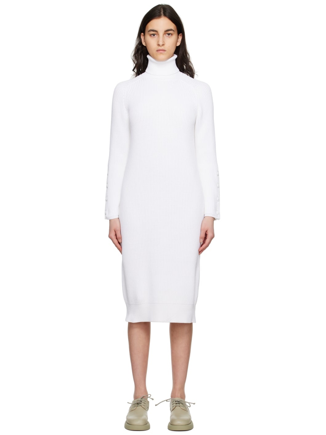 Rib knit cotton and nylon-blend dress. · Turtleneck · Raglan sleeves · Button vent at cuffs · Unlined · Logo-engraved tonal hardware Supplier color: Optical white 67% cotton, 33% polyamide. Made in Romania 231118F092003