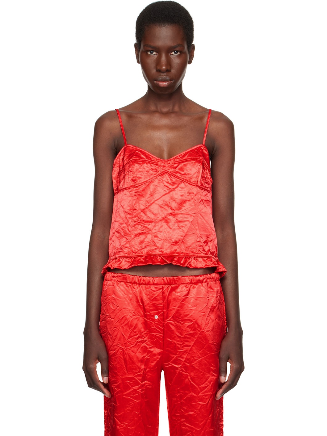 Crinkled nylon- and viscose-blend satin camisole. · Sweetheart neck · Ruffled trim at hem · Zip closure at side seam · Fixed spaghetti straps Supplier color: Red 54% polyamide, 46% viscose. Made in Italy 251512F111002