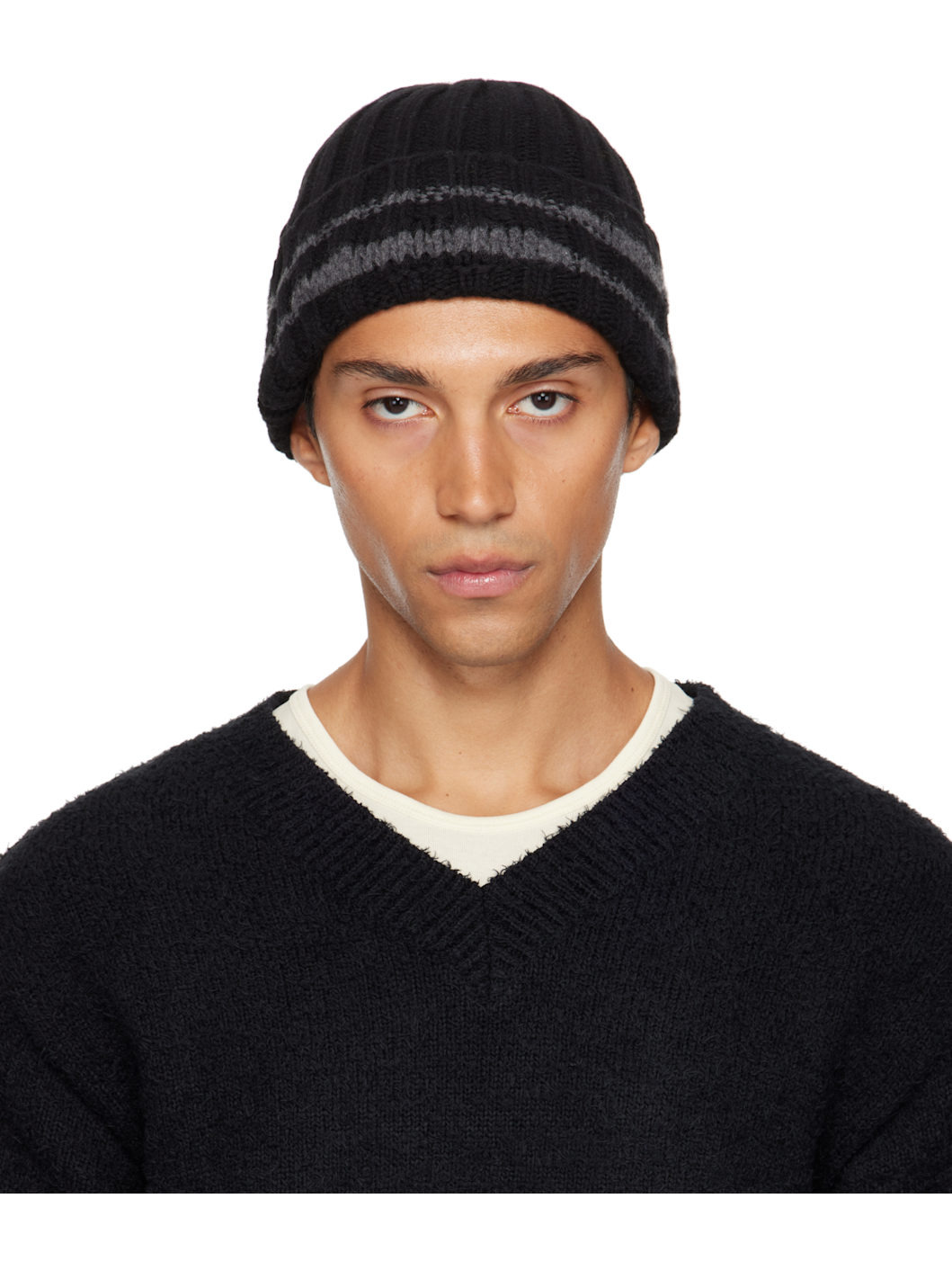 Knit wool beanie. · Reverse-knit stripes throughout · Intarsia stripes in gray at rolled brim Supplier color: Black 100% wool. Made in Portugal 252505M138000