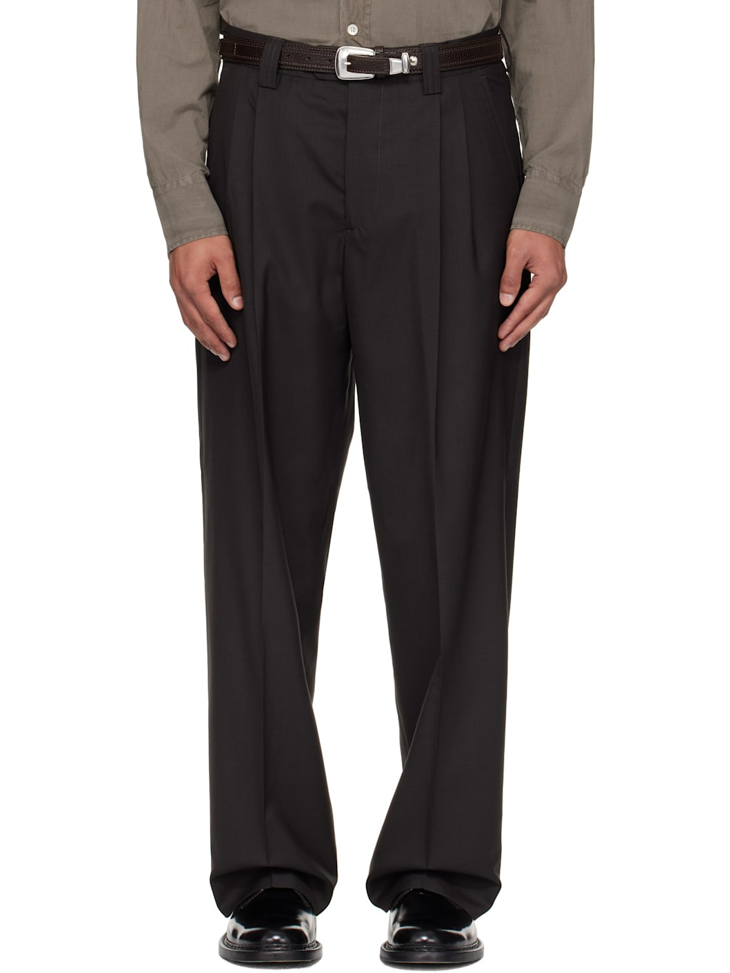 Deadstock wool twill trousers. · Wide straight-leg · Mid-rise · Belt loops · Four-pocket styling · Zip fly · Pleats at front · Creased legs · Partial satin lining Supplier color: Coffee twill wool Body: 100% wool. Trim: 70% polyester, 30% cotton. Lining: 100% polyester. Made in Portugal 252505M191003