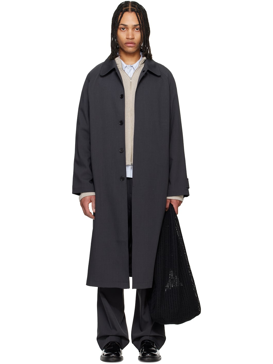 Relaxed-fit deadstock stretch wool twill coat. - Detachable button throat guard at spread collar - Concealed button closure - Welt pockets - Raglan sleeves - Adjustable button tab at cuffs - Central vent at back hem - Welt pocket at interior - Full satin lining - Resin hardware Supplier color: Dark grey wool