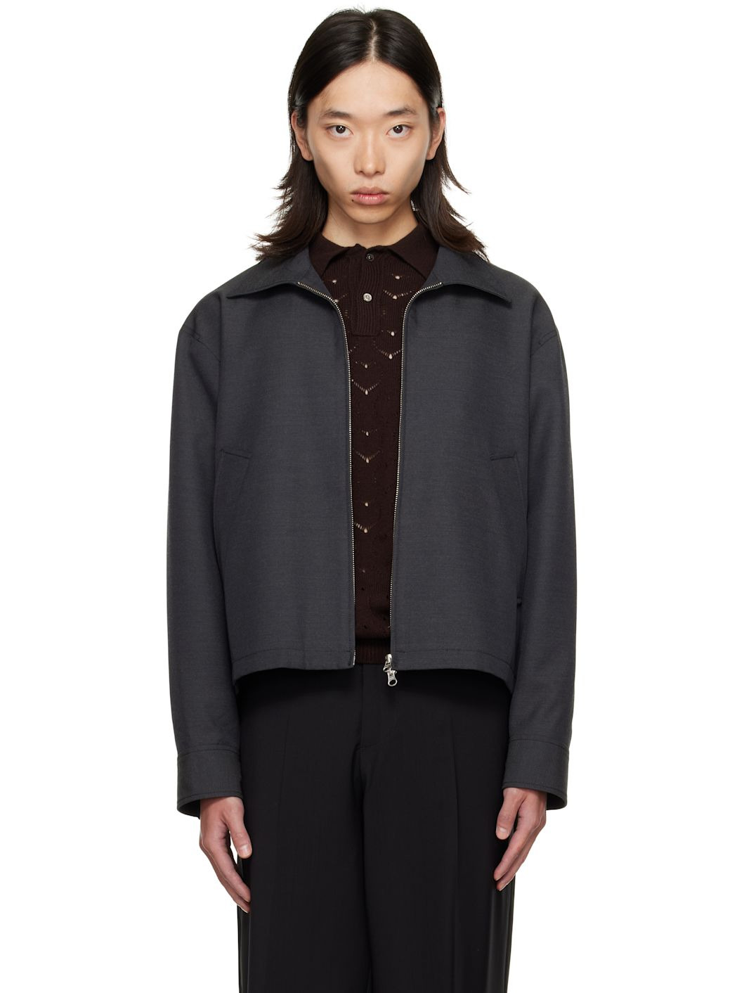 Plain-woven wool jacket. · Spread collar · Two-way zip closure · Welt pockets at waist · Buttoned barrel cuffs · Adjustable buttoned tabs at back hem · Patch pocket at interior · Partial satin twill lining Supplier color: Dark grey wool Body: 100% wool. Lining: 100% polyester. Made in Portugal 252505M180002